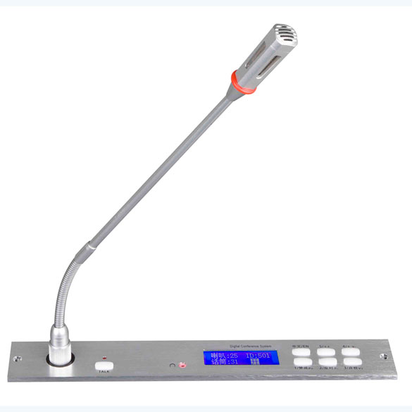 話筒音頭采用最新聲學研究成果,使用金屬鋁合金四方形結構;使得語音更加清晰厚實,頻響寬廣,靈敏度高不易產(chǎn)生嘯叫等特點。 嵌入式安裝會議話筒座,采用鋁合金拉絲工藝,分拆式設計 話筒具有6個輔助功能鍵和1個開啟/關閉鍵、 支持1鍵式語言切換,1鍵MUTE靜音和2鍵話筒音量、2鍵喇叭音量控制,按鍵都具有紅色指示發(fā)光,操作直觀,有效防止操作失誤 支持討論及視頻自動跟蹤功能 具有耳機監(jiān)聽功能 具有LED液晶屏顯示并可切換中/英文操作界面