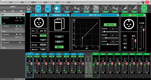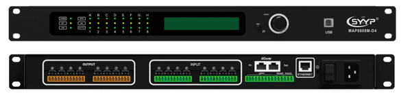 MAP0808M-D4是一款8進8出的自動混音媒體矩陣,配備8路模擬輸入和8路模擬輸出,內置反饋抑制,自動混音,矩陣混音,均衡器,分配器,壓縮器等DSP功能,支持Dante網(wǎng)絡音頻功能擴展,通過USB免驅連接電腦軟件控制,RS232,TCP/IP連接中控遠程控制,適合用在各種場合的擴音工程。 ■4路Dante網(wǎng)絡數(shù)字音頻輸入,4路Dante數(shù)字音頻經DSP處理后輸出 ■8路模擬音頻輸入8路模擬音頻輸出,支持麥克風輸入和線路輸入自由切換 ■Dante網(wǎng)絡數(shù)字音頻與模擬音頻可自由切換 ■每路輸入帶48V幻象電源,可以上位機軟件開關控制 ■模擬音頻每路輸入帶反饋抑制功能開關,兩檔調節(jié) ■帶自動混音和矩陣混音功能 ■帶攝像跟蹤功能 ■輸入31段PEQ可調,輸出10段PEQ可調 ■USB免驅自動連接軟件,支持TCPIP多臺機器集中管理調試,配置RS232/RS485中控控制接口,GPIO外擴控制接口