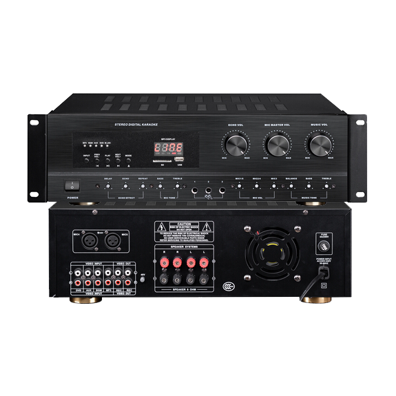 1. 3U機型,經(jīng)典拉絲鋁面板外觀 2. 面板全部為暗調式旋鈕,可調節(jié)話筒的混響效果,高低音均衡調節(jié),與音樂的高低音調節(jié). 3. 總共有五路話筒輸入,前三路為6.35插座,后兩路為卡農平衡輸入,并設有48V幻象電源. 4. 音樂信號有四路輸入,兩路錄音輸出 5. 設有USB/藍牙播放器,帶有數(shù)碼管顯示和語音提示音(語音可以關閉) 功率/POWER(8歐): 130W / 150W / 250W 輸入阻抗/INPUT IMPEDANCE: 20KOHM 總諧波失真/THD : 0.2% 頻率響應/FREQUENCY RESPONSE: 35HZ-20KHZ 信噪比/SNR: 82DB 消耗功率/POWER CONSUMPTION: 350W 輸入靈敏度/INPUT SENSITIVITY: 0.25V 冷卻/COOL DOWN: 風扇 保護/PROTECTION: 短路,直流 外形尺寸 Machine dimensions: 430X358X132mm 包裝尺寸 Carton size: 490x430x180mm